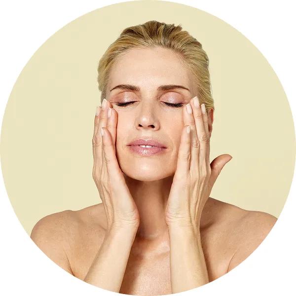 Aplica ½ ampolla en la mano y masajea sobre rostro, cuello y escote, evitando el contorno de los ojos.