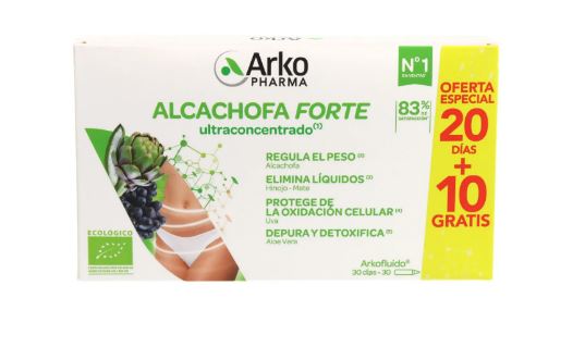 Arkofluido® Alcachofa Forte Ultraconcentrado es un complemento alimenticio en formato de 30 ampollas bebibles, formulado con ingredientes 100% naturales y de origen ecológico. Su fórmula combina extractos de alcachofa, hinojo, mate, uva y aloe vera, conocidos por sus propiedades depurativas y digestivas. Este producto está diseñado para ayudar a eliminar toxinas, favorecer la digestión y contribuir al control del peso de manera natural.