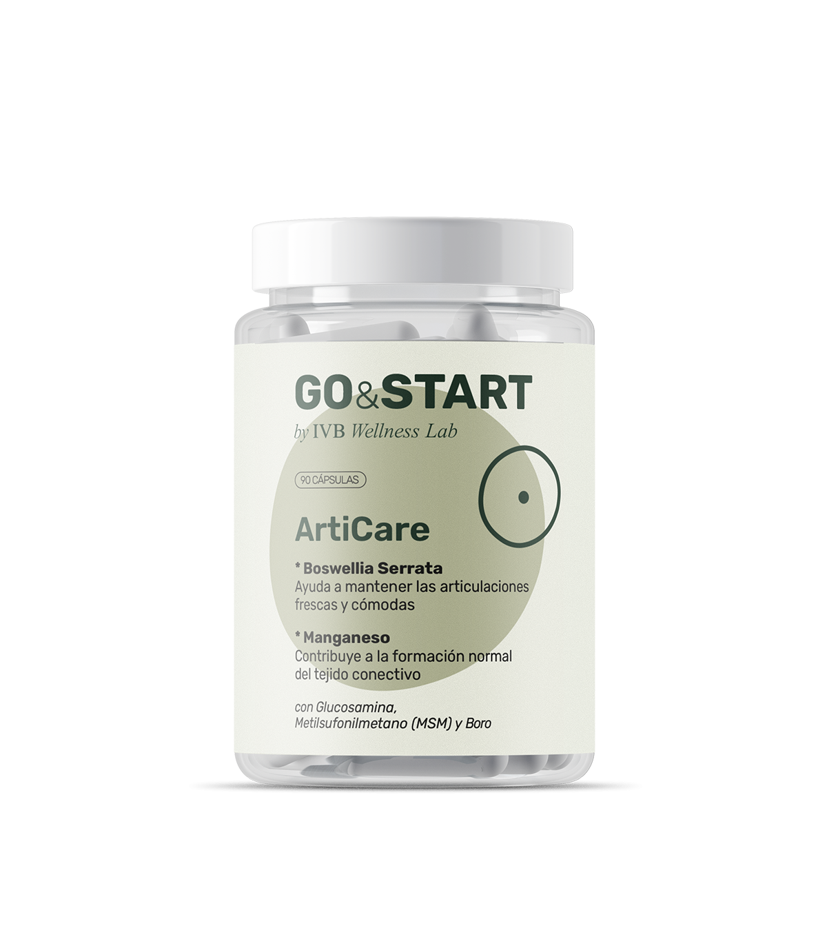 INGREDIENTES: Sulfato de D-glucosamina 2KCl, Metilsulfonilmetano, cápsula [(Agente de recubrimiento: Hidroxipropilmetilcelulosa), colorante (carbonato cálcico)], Agente de carga (Celulosa microcristalina) AprésFlex® [(Extracto seco de Boswellia, Boswellia serrata, resina) (20% ácido 3-O-acetil-11-keto-ß-Boswélico (AKBA)], Borato sódico, antiaglomerante (sales magnésicas de ácidos grasos) y gluconato de manganeso.