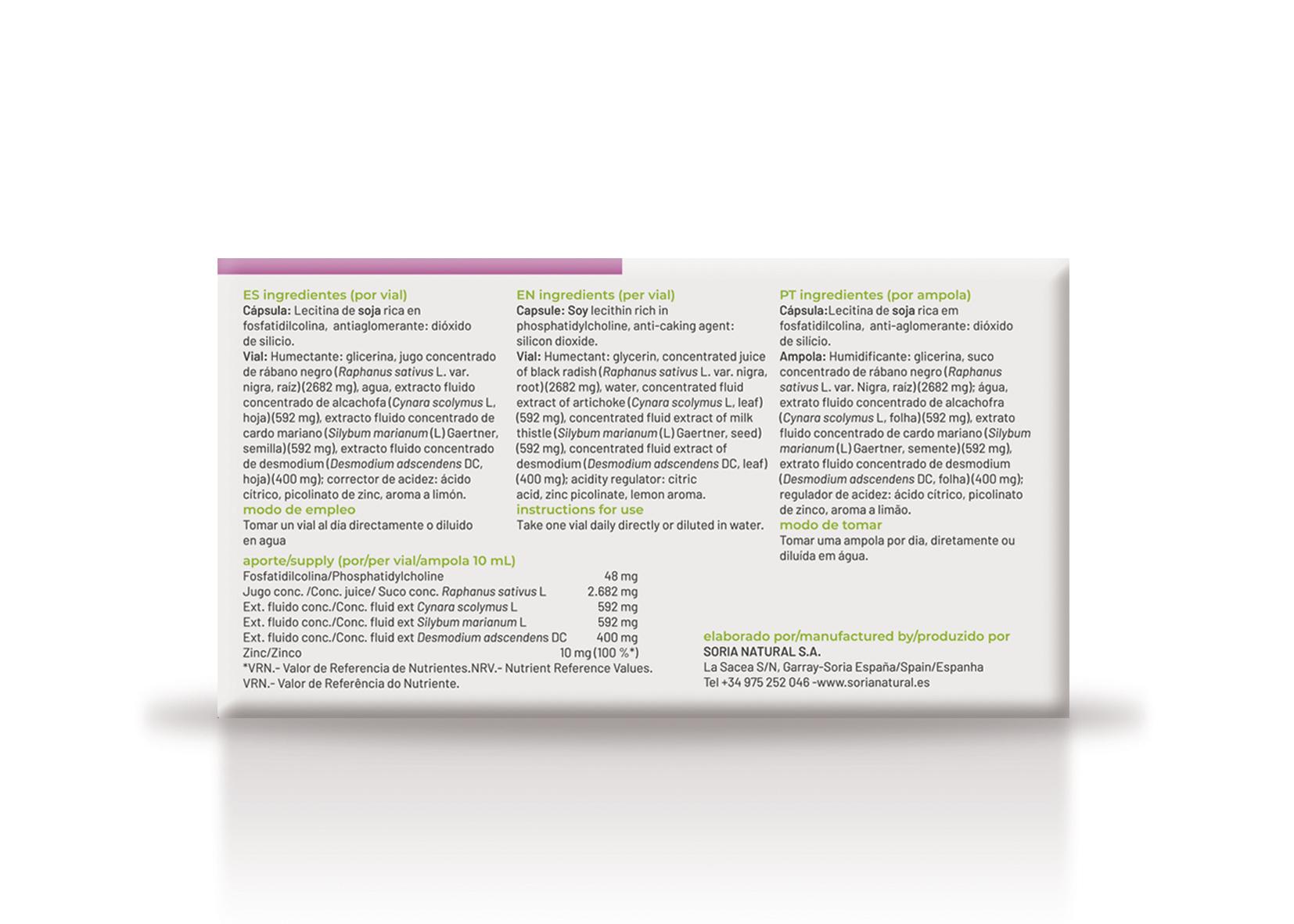 Vial: Humectante: glicerina, extracto concentrado de rábano negro (Raphanus sativus L. var. nigra, raíz) (2682 mg), agua, extracto fluido concentrado de alcachofa (Cynara scolymus L., hoja) (592 mg), extracto fluido concentrado de cardo mariano (Silybum marianum (L) Gaertner, semilla) (592 mg), extracto fluido concentrado de desmodium (Desmodium adscendens DC, hoja) (400 mg); corrector de acidez: ácido cítrico, picolinato de zinc, aroma a limón.