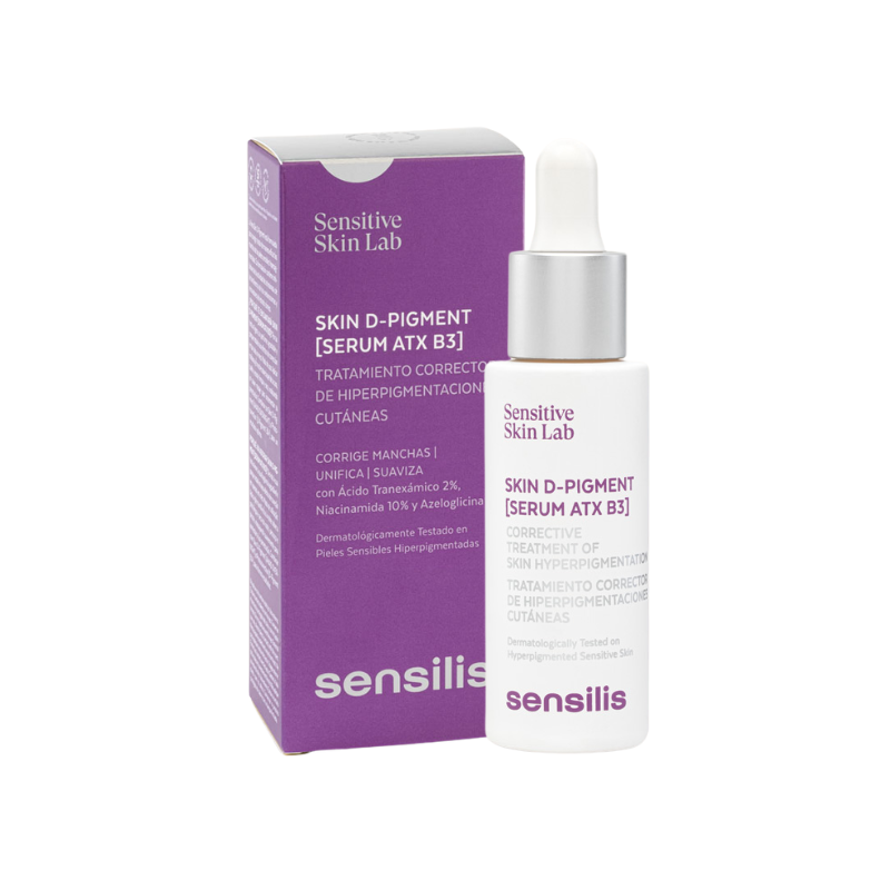 Sensilis Skin D-Pigment ATXB3 es un sérum de acción despigmentante cuya formulación se basa en la acción conjunta del Ácido Tranexámico (ATX al 2%) junto a Niacinamida (10%) y Azeloglicina (3%) para eliminar de forma eficaz la hiperpigmentación (manchas) del rostro en las pieles más sensibles y delicadas.