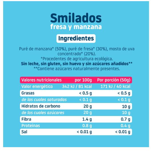 Puré de manzana* (50%), puré de fresa* (30%), mosto de uva concentrado* (20%). *Procedente de agricultura ecológica.