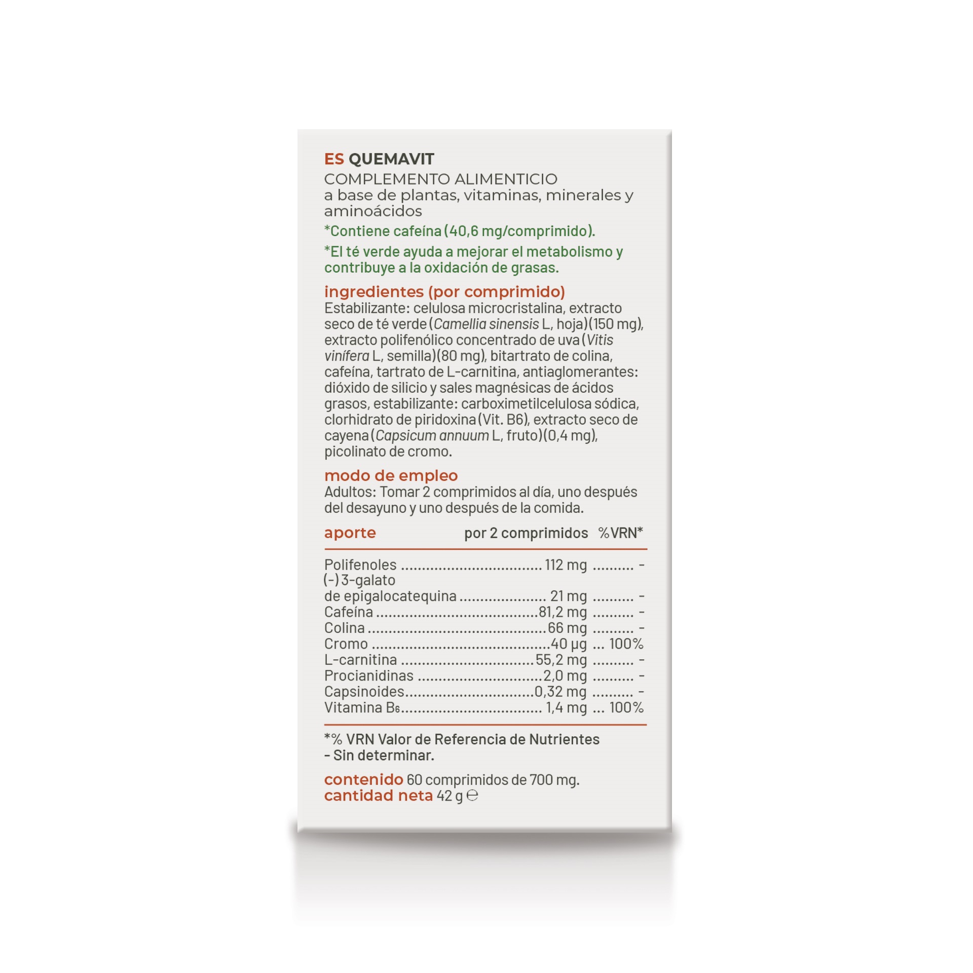 Quemavit son comprimidos elaborados con semillas de uva, capsiate, té verde, vitamina B6 y cromo. El efecto termogénico, es la manera natural del organismo  de incrementar el metabolismo energético aumentando el consumo de energía y disminuyendo la acumulación de grasa en el organismo.