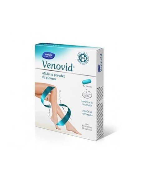 Máyla Pharma Venovid 60 comprimidos, una solución natural para mejorar la circulación sanguínea y aportar sensación de ligereza en las piernas. Un suplemento nutricional con 8 activos naturales que aporta desde el interior los activos necesarios para mejorar estados de piernas cansadas en pacientes que pasan muchas horas de pie y con problemas de retorno venoso.